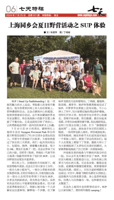 本周出版的《七天》刊登了上海同乡会7月13-15日三天二夜露营游的活动报道,请尽早取报阅读留念。感谢合作媒体的大力宣传支持!感谢文字、图片、视频和美篇的创作者和编辑者,活动美篇的美篇正在更新之中,敬请关注,谢谢!