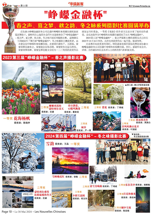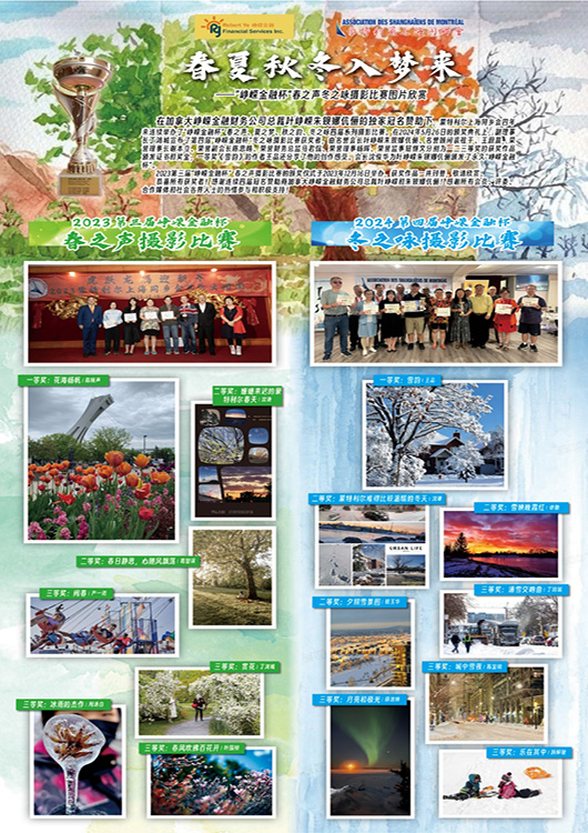 “峥嵘金融杯”- 春之声、夏之梦、秋之韵、冬之咏系列摄影比赛由加拿大峥嵘金融服务有限公司连续四届独家冠名赞助,目前即将进入尾声,最后一季”冬之咏”摄影比赛作品的拍摄时间为2023年12月20日至2024年3月20日,报名也将于4月15日截止,请尽快拍摄和报名。最新报名的全部参赛作品已经编入美篇,予以预展,敬请点击欣赏,美篇内也有报名链接,可以一键报名。